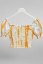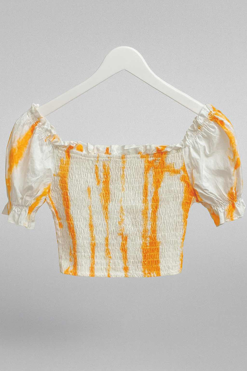 Bring a splash of sunshine to your wardrobe with this off-shoulder crop top, designed in a crisp white base with vibrant orange tie-dye accents. Featuring puff sleeves, a ruched neckline with a front tie, and a smocked waist for the perfect fit, this top is all about playful charm and effortless comfort. Perfect for summer outings, beach days, or casual hangouts—pair it with denim shorts or a flowy skirt for a chic, carefree vibe.